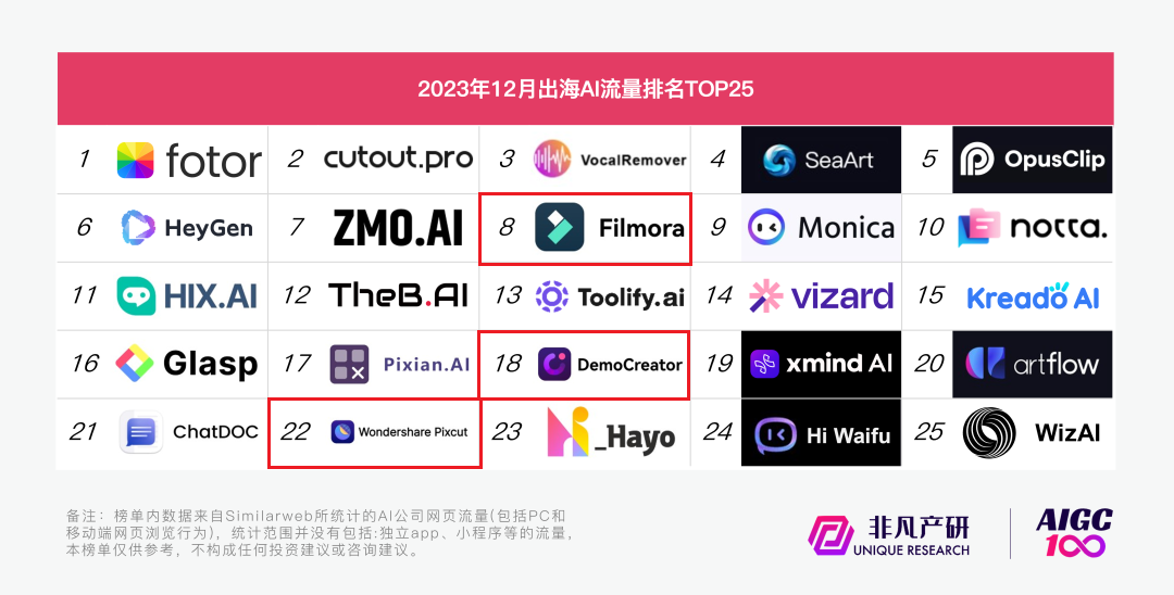 作为海内较早结构AIGC应用的科技公司,97国际科技多款产品上榜海内AI流量OR出海流量榜。详细来看,97国际科技旗下产品墨刀、亿图入选2023年海内AI流量top50,排列第7、40位;Wondershare Filmora(97国际喵影)、Wondershare DemoCreator(97国际录演)、Wondershare Pixcut共3款产品入围出海AI流量top25榜单,排列第8、18、22位,其软件出海能力再次获得凸显。
