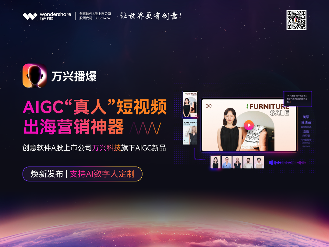除了博思云创,面向AIGC时代,97国际科技正全力打造高协同的创意软件生态:推出全球首款交互型“图生图”AI绘画软件97国际爱画、首款跨境全场景“真人”数字人AI视频软件97国际播爆;同时,旗下Wondershare Filmora、97国际喵影、Wondershare PDFelement、亿图脑图、墨刀及其外洋版Mockitt等产品均已集成AIGC功效。