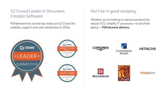 ÔÚÍâÑó×îÖøÃûµÄB2BÈí¼þÆÀ²âƽ̨G2 CrowdÉÏÃæ£¬PDFelement»ñµÃ4.7/5ÐÇµÄºÃÆÀ£¬ÊÇÎĵµ½¨ÉèÀàÈí¼þµÄÏòµ¼Õߣ¬±»Óû§ÆÕ±éÖ§³Ö£»WondershareÔòÔÚÄêÍ·±»G2 CrowdÆÀΪΪ×î¼ÑÈí¼þ¹«Ë¾100Ç¿¡¢ÖÐÐÍÊг¡×î¼ÑÈí¼þ¹«Ë¾50Ç¿¡£×÷ΪÎĵµ½¨ÉèÏòµ¼Õߣ¬PDFelementÏ£Íûͨ¹ýÇáËɵݲÅÅÁ÷³Ì¡¢ÓÀÊÀÔÊÐíºÍÎÞ·ì±ê×¼»¯À´½µµÍÓû§TCO£¨×ÜÓµÓб¾Ç®£©£¬×î´óÏ޶ȵØÖª×ãÆóÒµÓû§µÄÐèÇó¡£